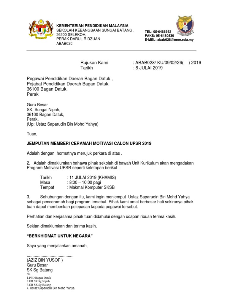 Surat Jemputan Penceramah Motivasi Upsr 2019 Pdf