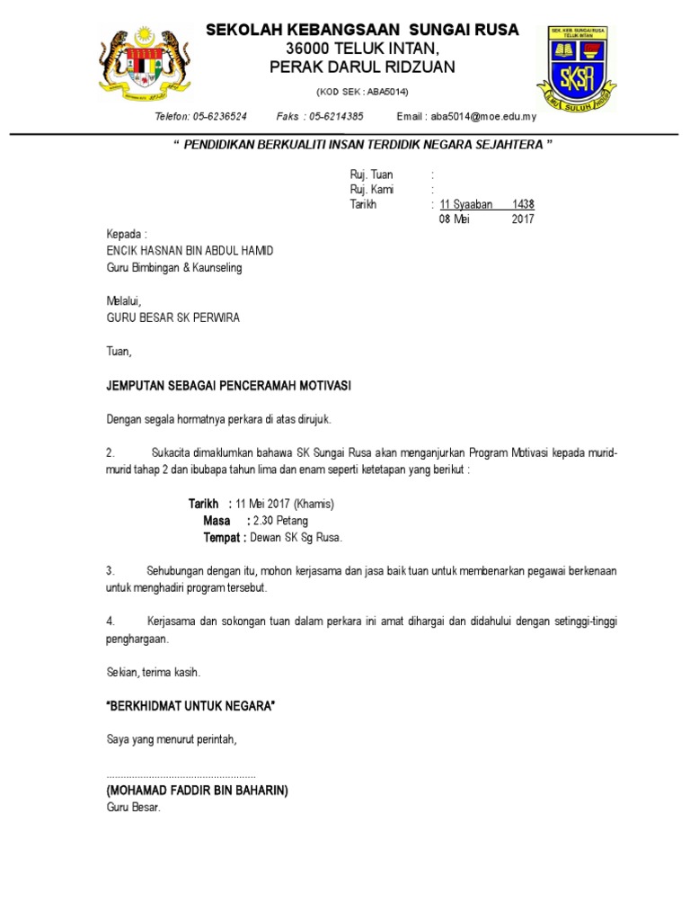 Surat Rasmi Jemputan Sebagai Penceramah Sekolah Motivasi Surat. Selain itu gambar ini juga memiliki berbagai ukuran. Sehubungan dengan itu tuanpuan.